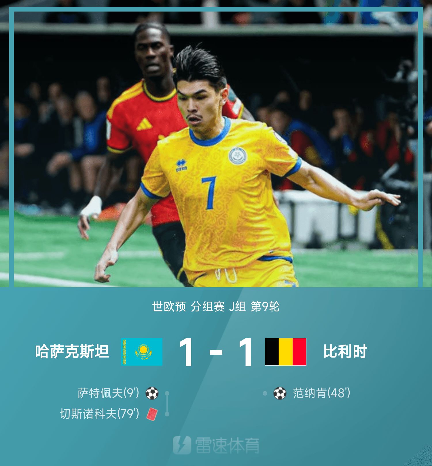 6686体育11月15日讯 26赛季世欧预分组赛J组第9轮,哈萨克斯坦1-1战平比利时。上半场竞赛,萨特佩夫抓住泰特差错机会单刀破门,下半场范纳肯顶球破门扳平赛果分,随后比利时发起猛攻,切斯诺科夫蹬踏染红,但1-1的赛果分保持到终场,比利时无缘提前晋级世杯赛。