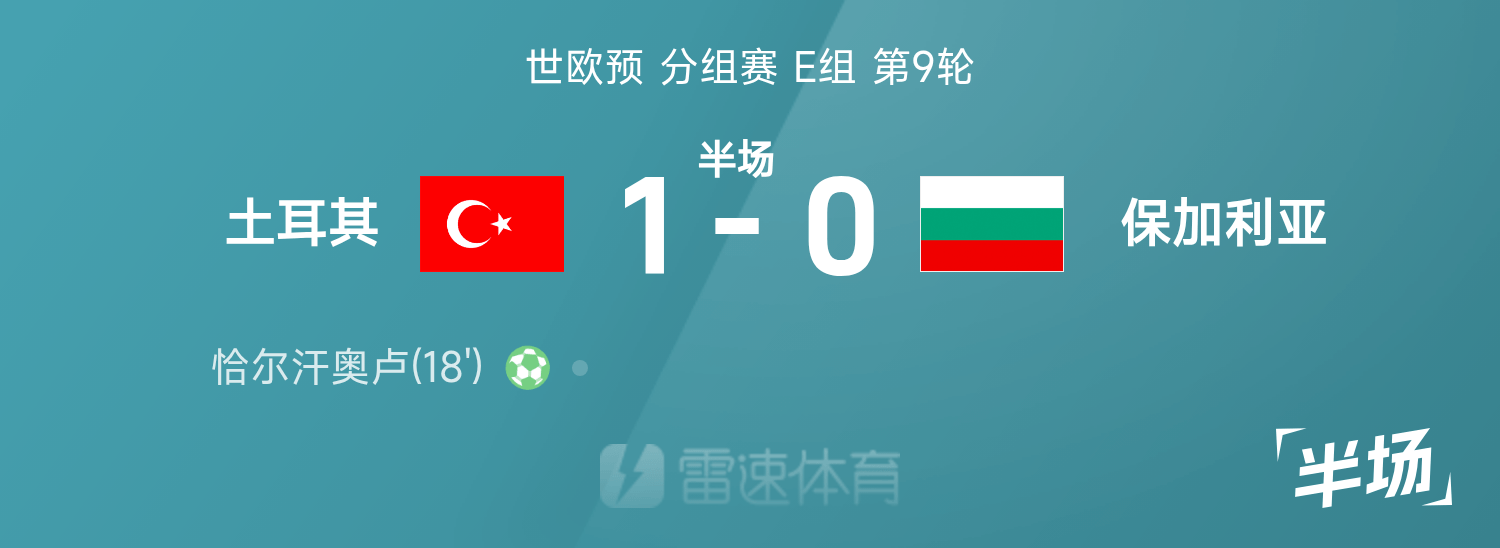 世欧预半场:恰尔汗奥卢点射破门,土耳其1-0保加利亚