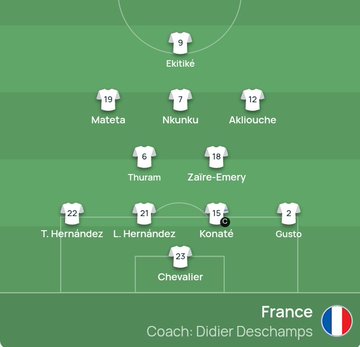 法国队首发:23-舍瓦利耶、22-特奥、21-卢卡斯、15-科纳特、2-古斯托、6-图拉姆、18-埃梅里、19-马特塔、7-恩昆库、12-阿克利乌舍、9-埃基蒂克