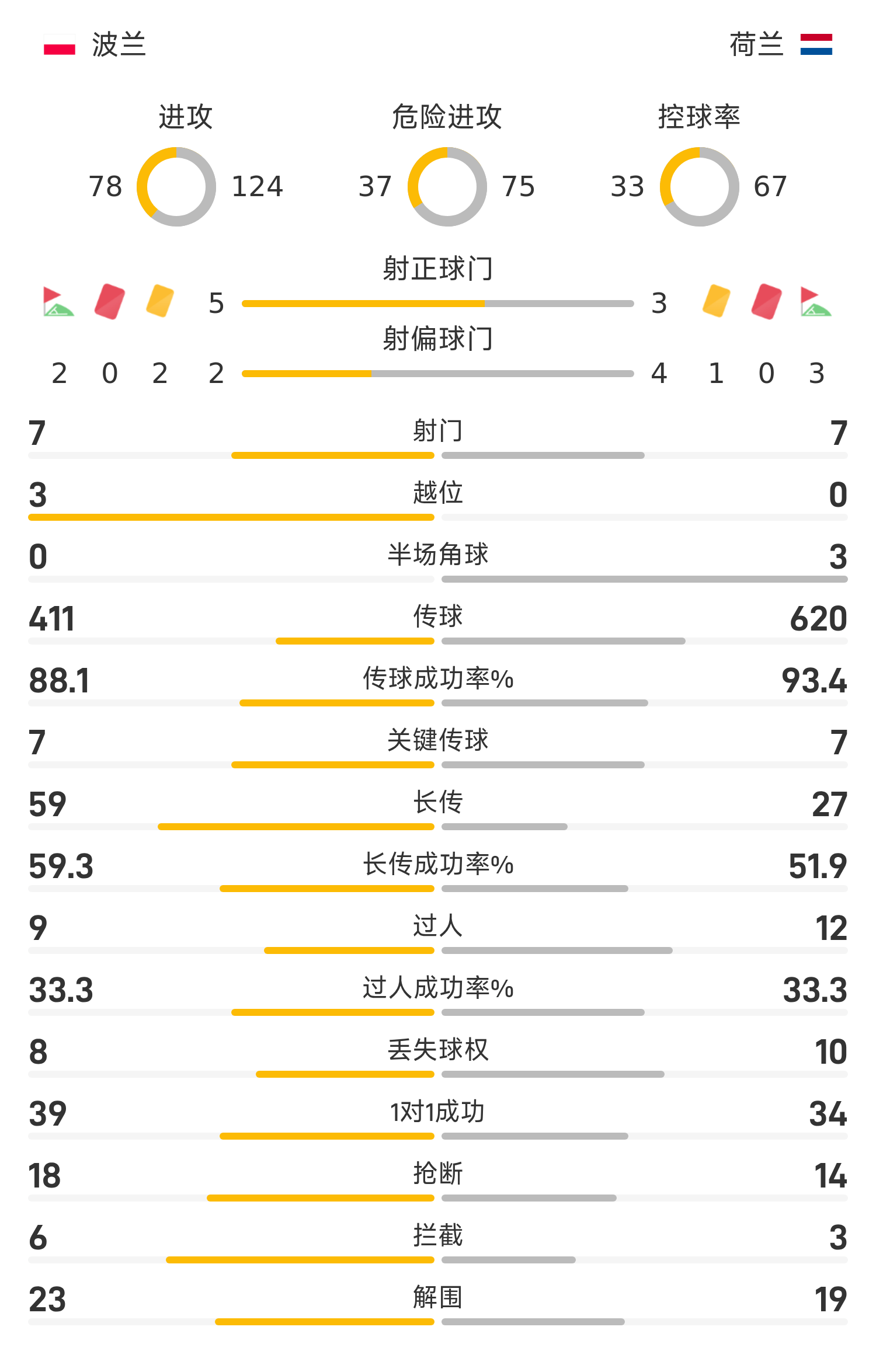 荷兰首发阵容:1-费布鲁亨、4-范戴克、2-海特勒伊达(74’12-范黑克)、3-廷贝尔、15-范德芬、21-德容、18-马伦、19-克鲁伊维特(74’14-赖因德斯)、11-加克波、8-赫拉芬贝赫(89’16-斯豪滕)、10-德佩(89’9-艾美加)