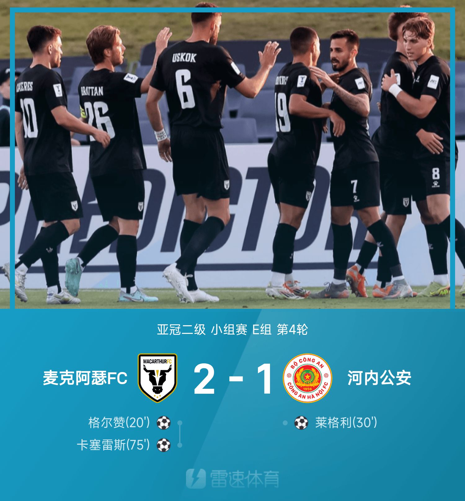 6686体育11月06日讯 25/26赛季亚冠二级分组赛E组第4轮,麦克阿瑟FC主队场以2-1力克河内公安。上半时竞赛,格尔赞为麦克阿瑟首开纪录,莱格利扳平局,双方打成1-1;下半时竞赛,卡塞雷斯打进制胜球。麦克阿瑟以7分在小组领跑,河内以5分仍然暂列小组第二。
