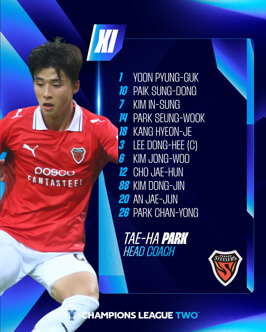 浦项铁人首发:1-尹平国、7-金仁成、10-白星东、14-朴乘煜、6-金钟佑、3-李东熙、12-赵在勋、18-姜现题、26-朴灿勇、20-安在俊、88-金东进