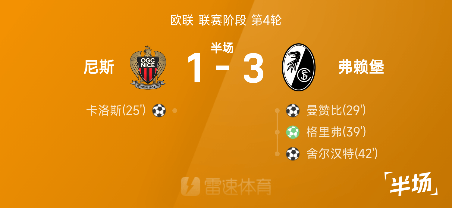 欧联半场:铃木唯人助攻+造点,弗赖堡3-1尼斯