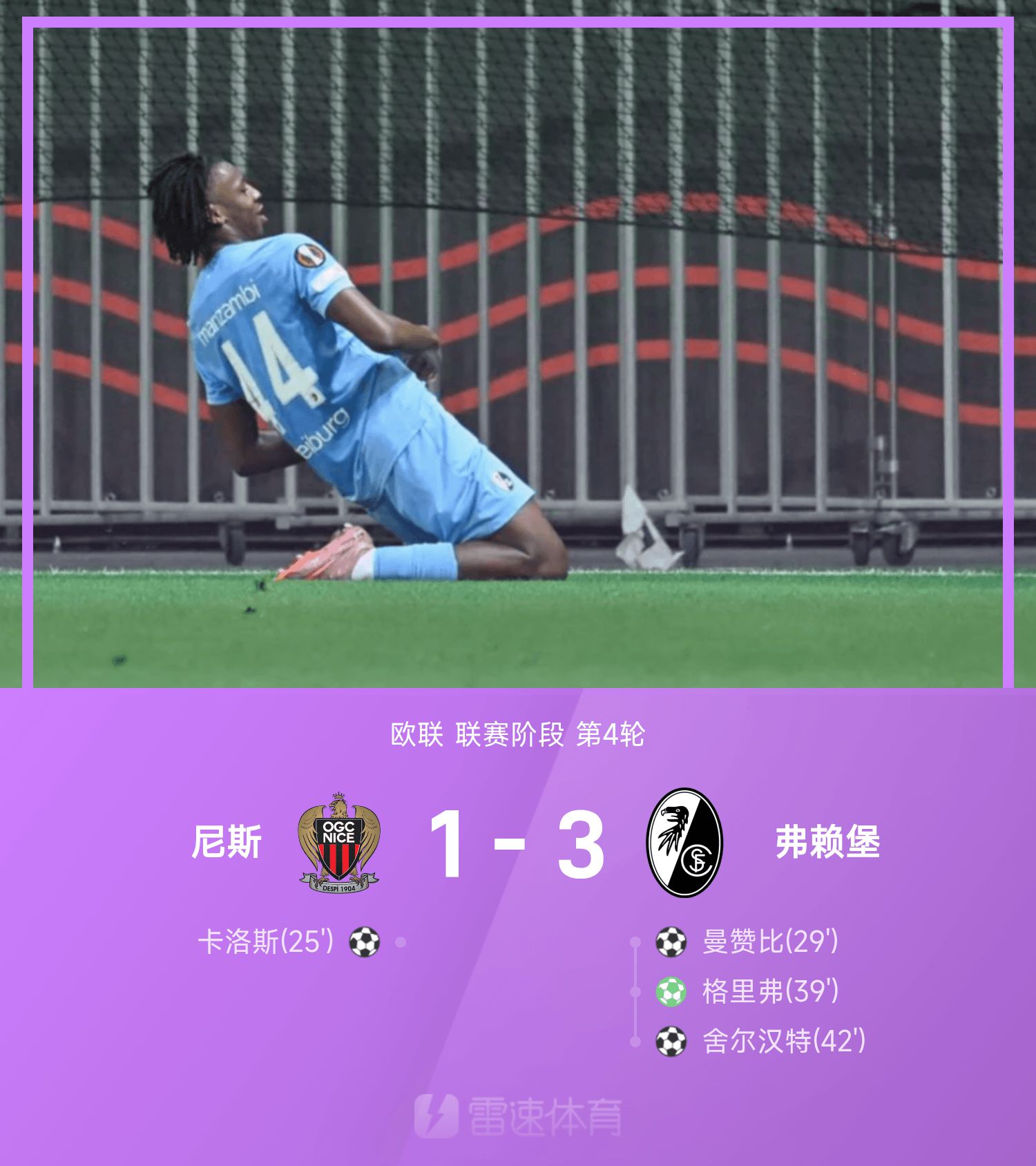 6686体育11月7日讯 25-26赛季欧联联赛事阶段第4轮,尼斯主队场迎战弗赖堡。此役上半场,卡洛斯单刀破门首开记录,曼赞比抽射建功扳平赛果分,格里弗主罚十二码命中,舍尔汉特推远角再入一球。易边再战,双方均未破门。全场竞赛终结,弗赖堡3-1战胜尼斯。