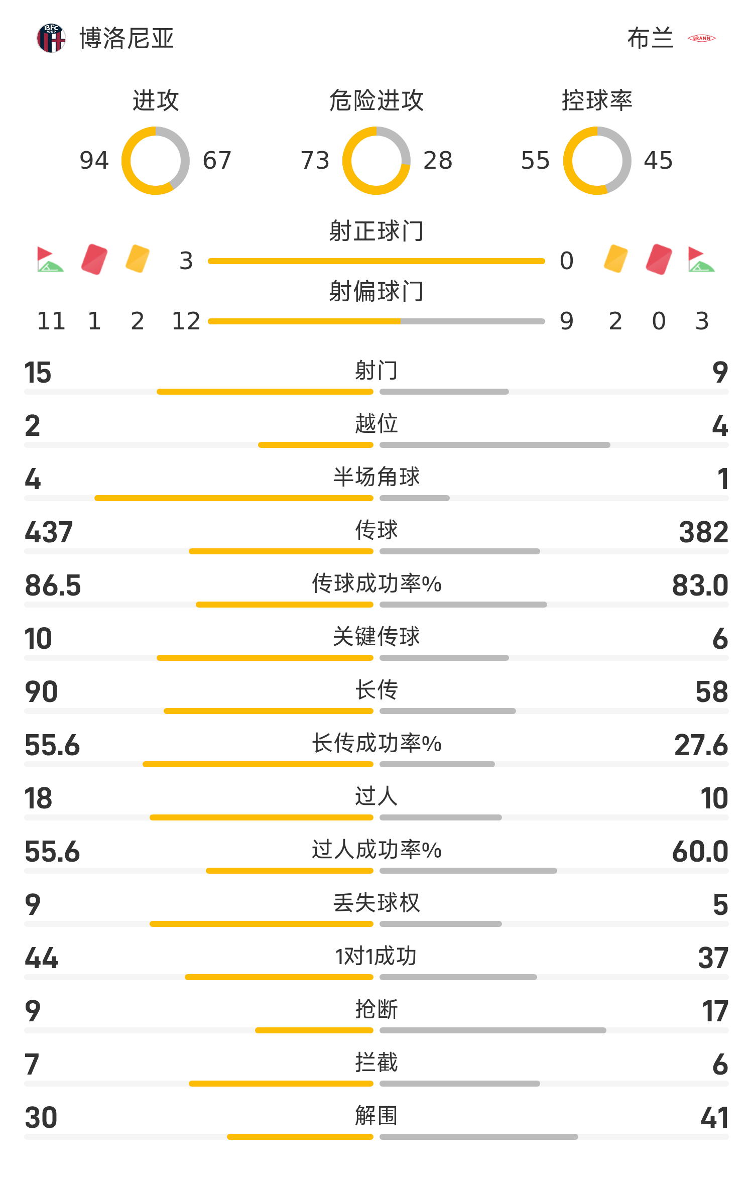 欧联战报:两队合计仅三次射正,十人博洛尼亚0-0闷平布兰