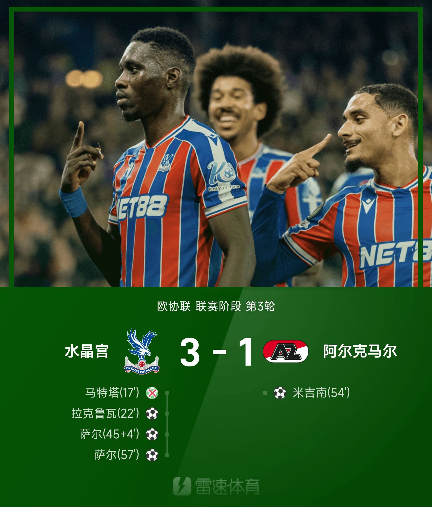 欧协联战报:萨尔双响,马特塔失点,水晶宫3-1阿尔克马尔