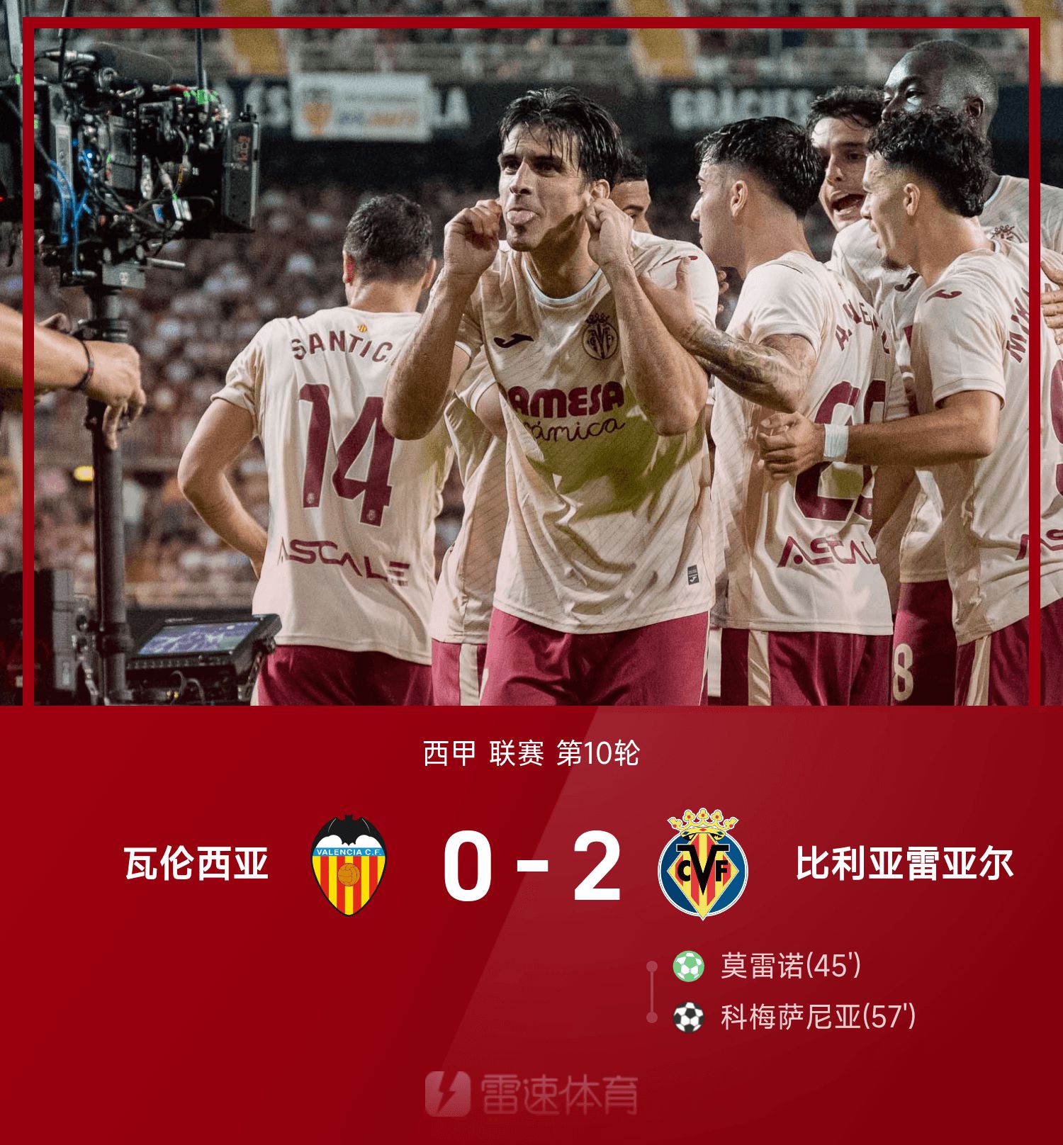 6686体育10月26日讯 25/26赛季西甲联赛事第10轮,比利亚雷亚尔2-0战胜瓦伦西亚。第45分钟,莫雷诺造点并亲自主罚命中,300场里程碑破门;第57分钟,科梅萨尼亚跟进射门破门锁定胜局。