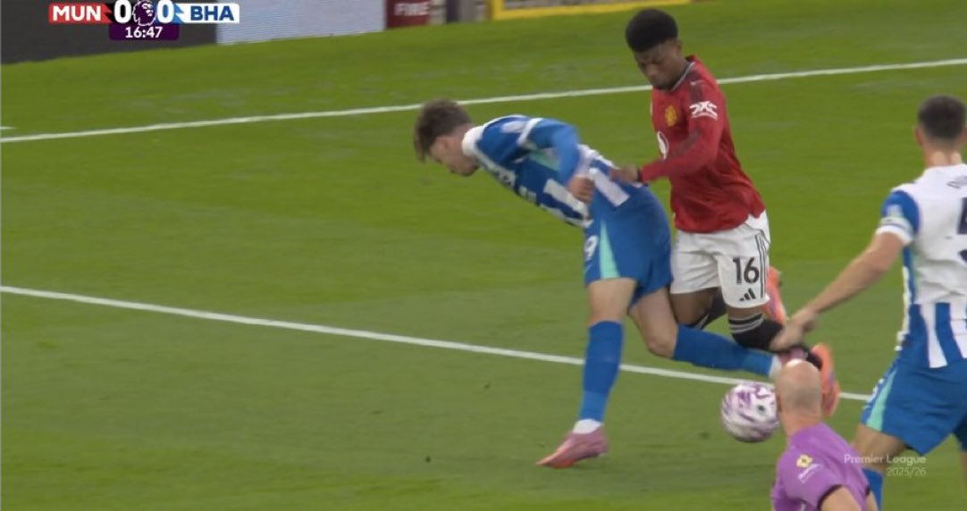 6686体育10月26日讯 英超第9轮,曼联暂时2-0领跑位布莱顿。竞赛第15分钟,阿马德突入三秒区内被德库耶佩放倒,裁判员并未做出裁决。