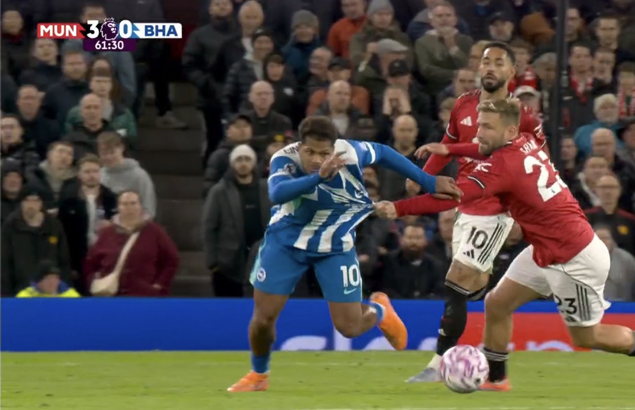6686体育10月26日讯 英超联赛事第9轮,曼联主队场对阵布莱顿的下半场竞赛第61分钟,卢克·肖守卫中拉拽布莱顿攻击手吕特致其倒地,随后曼联反击取得进球,3-0领跑位。主裁判判安东尼·泰勒拒绝吹罚卢克·肖此前的守卫违例。