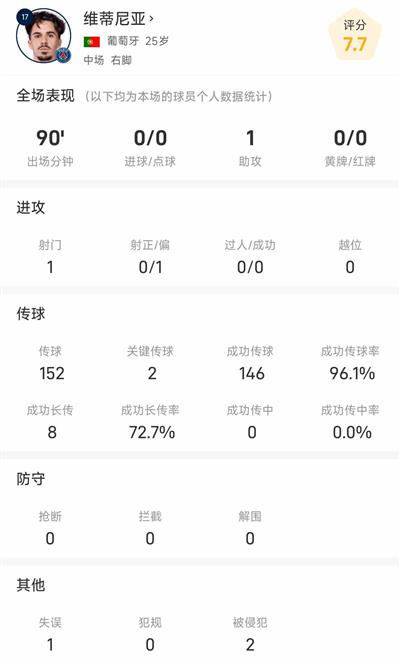 除了助攻,维蒂尼亚本场竞赛多项数据都非常出彩。