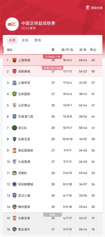 海港终结联赛事四连胜,最新的积分榜中,球队仍列榜首,但仅领跑位蓉城2分,蓉城今晚若战胜青岛西海岸,则升至榜首;申花今晚对阵大连英博,球队积57分暂列第三。