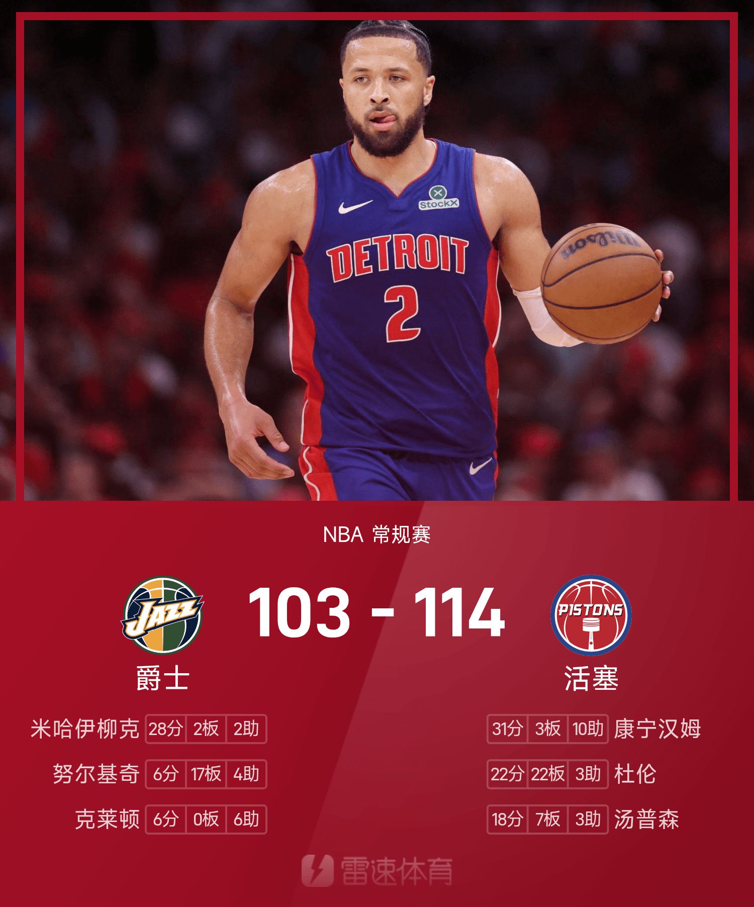 6686体育11月06日讯 25/26赛季NBA 常规赛,活塞对阵爵士。双方全场战罢,活塞114-103战胜爵士。康宁汉姆砍下全场最高的31分3板10助,率领活塞胜利取胜。