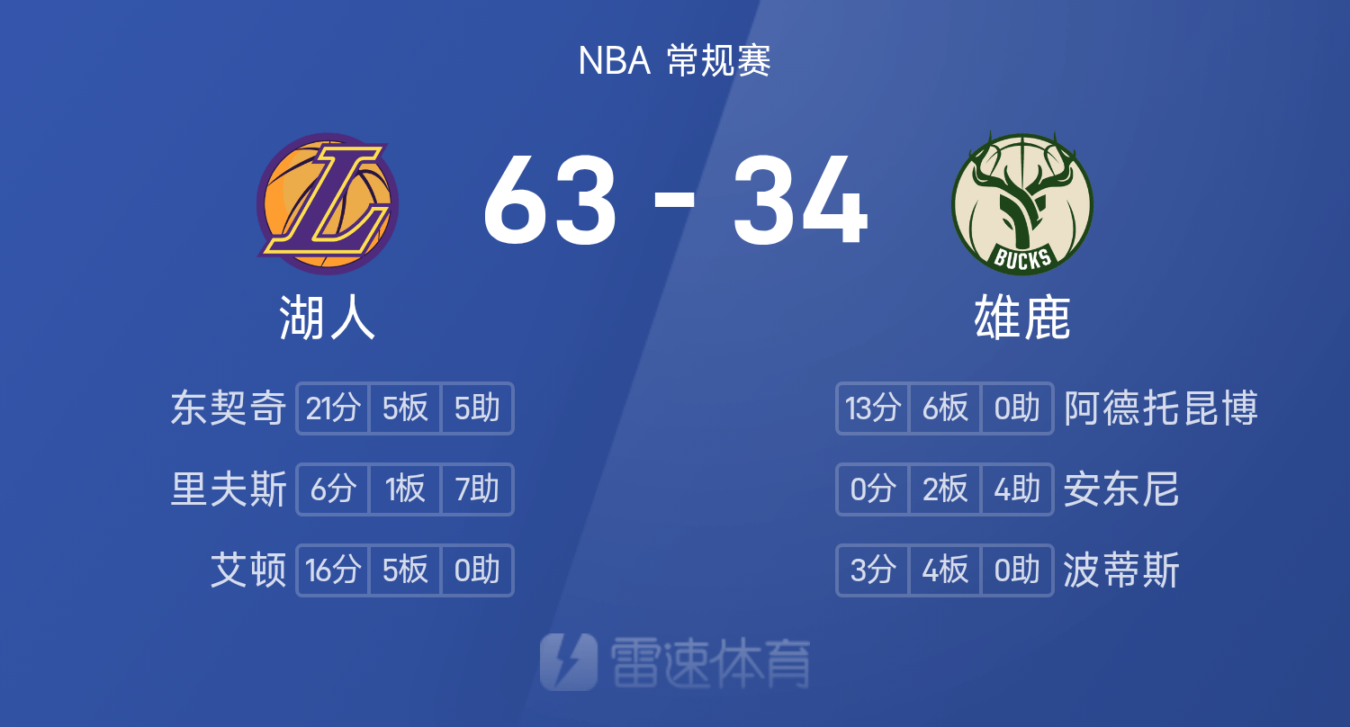 NBA半场:东契奇21分,雄鹿8分半合砍5分,湖人63-34雄鹿