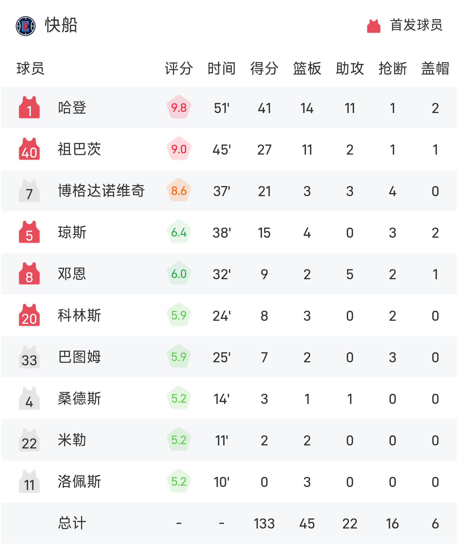 6686体育11月15日讯 25/26赛季NBA 常规赛 NBA杯分组赛,独行侠对阵快船。双方全场战罢,独行侠127-133不敌快船。哈登砍下全场最高的41分14板11助,率领快船胜利取胜。
