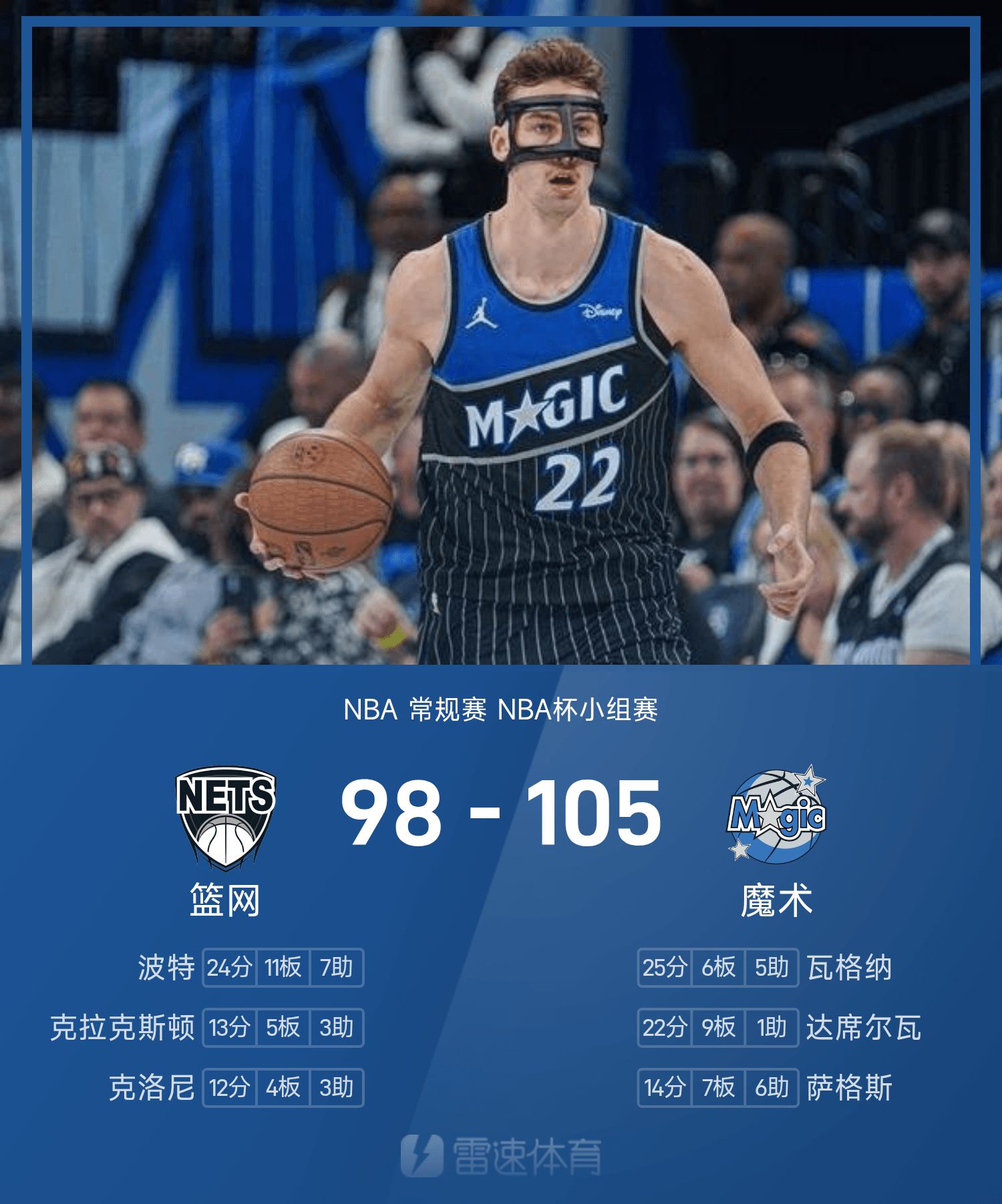 NBA战报:瓦格纳25分6板,魔术105-98击败篮网
