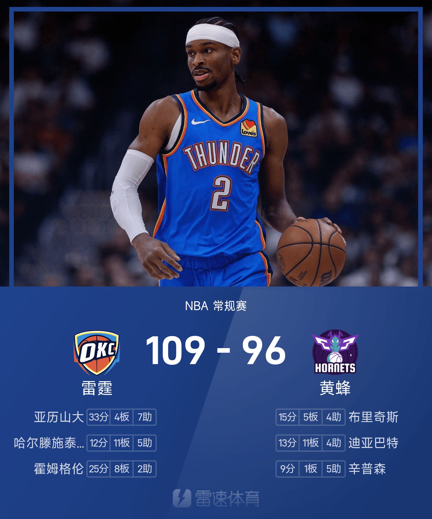 NBA战报:亚历山大33分7助,雷霆109-96击败黄蜂