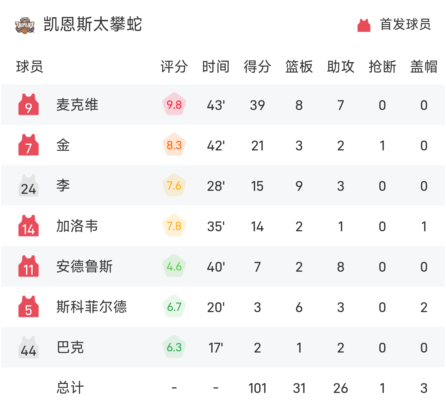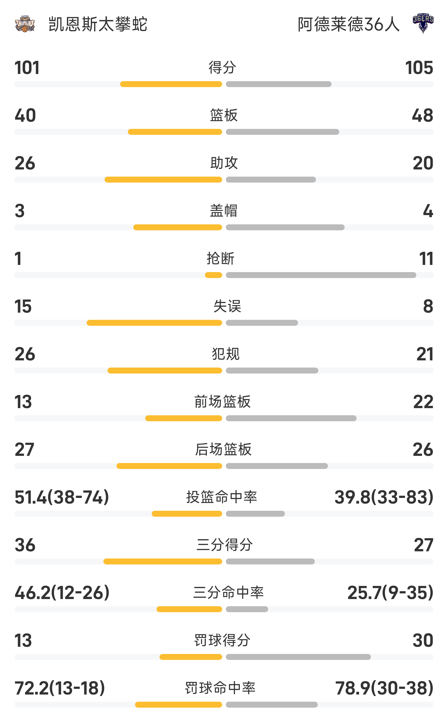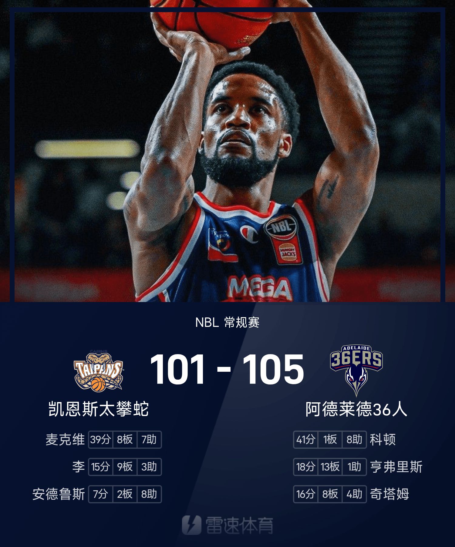 双方全场战罢,阿德莱德36人105-101战胜凯恩斯太攀蛇。
