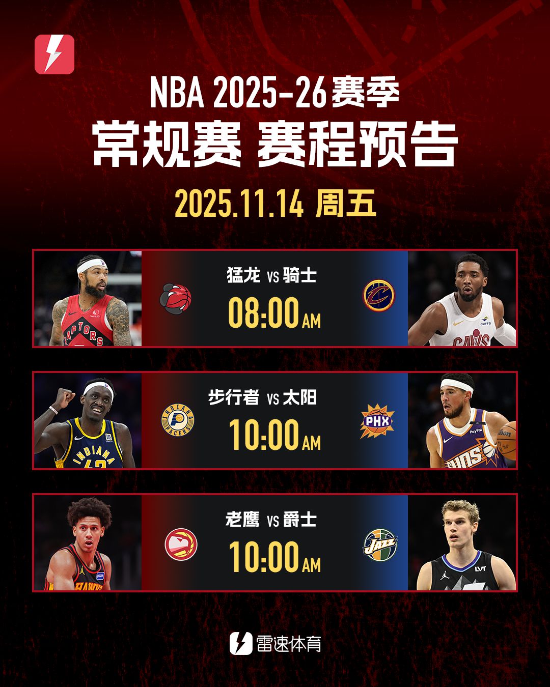 11月14日NBA看点:猛龙能否掀翻骑士,太阳冲击5连胜
