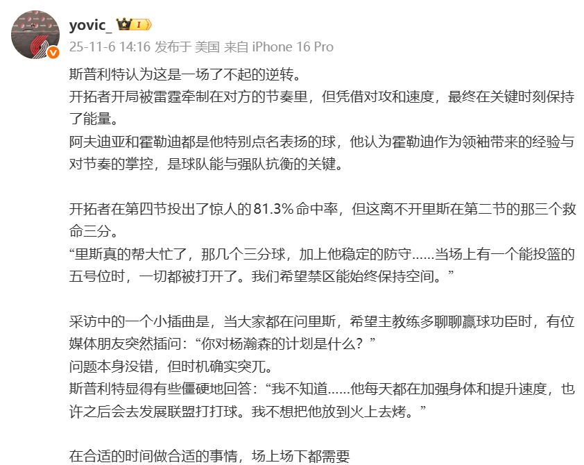 根据媒体人@yovic_报道,赛后开拓者临时主帅斯普利特谈到杨瀚森时表示:“杨瀚森每天都在加强身体和提高速度,之后也许会去发展联盟打竞赛,我不想把他放到火上去烤。”