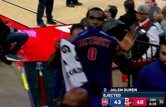 在第二节打到6分多钟,阿门和杜伦接连发生争执,第一次阿门故意违例杜伦,后者推开阿门吃到技术违例。很快两人再次对味,杜伦肘部直接打到阿门面部,裁判员回放直接驱逐杜伦,给了二级恶意违例。