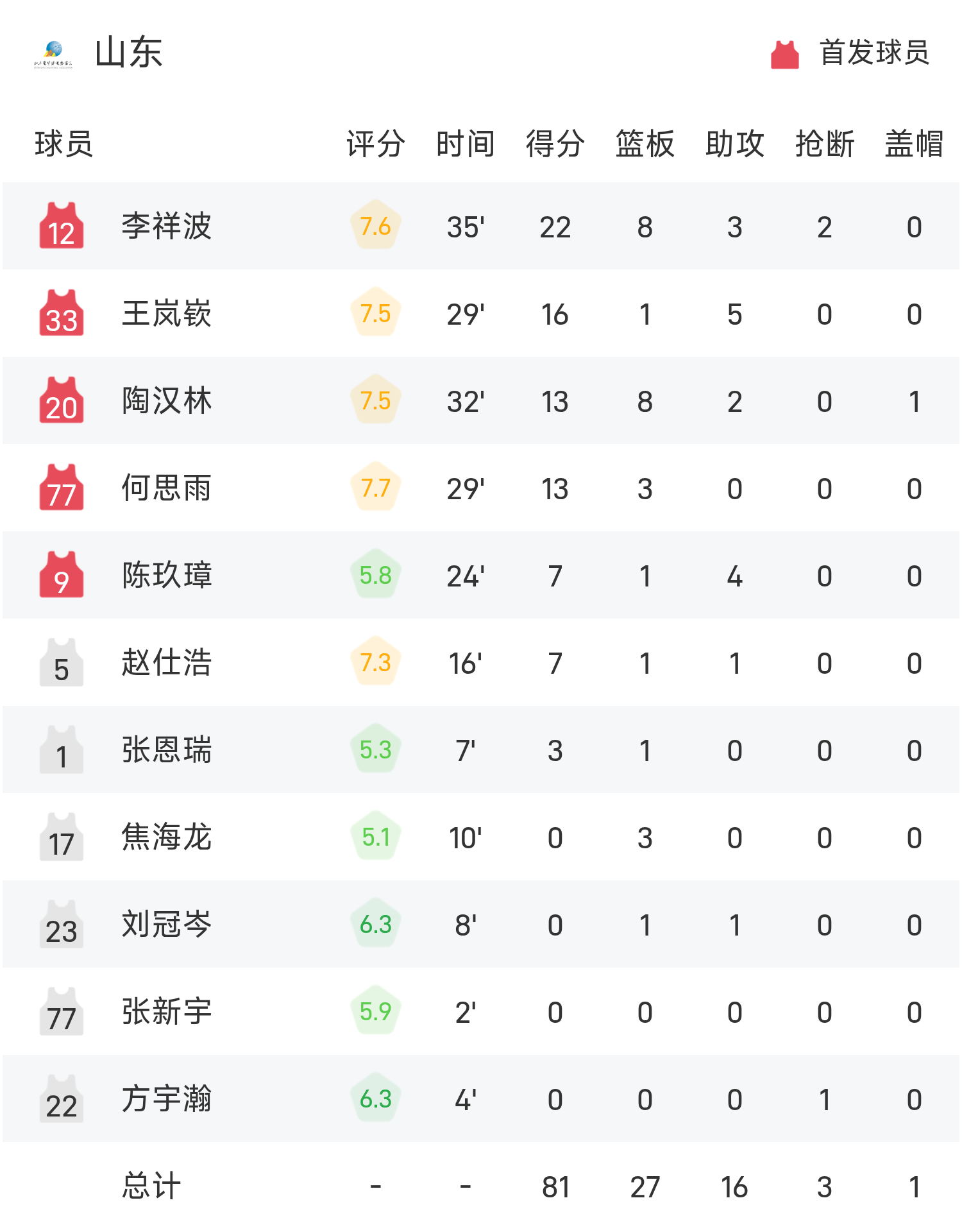 6686体育11月06日讯 全运男篮分组赛,浙江对阵山东。双方全场战罢,浙江85-81战胜山东。余嘉豪得到18分9板1助率队取胜,李祥波空砍全场最高的22分8板3助。