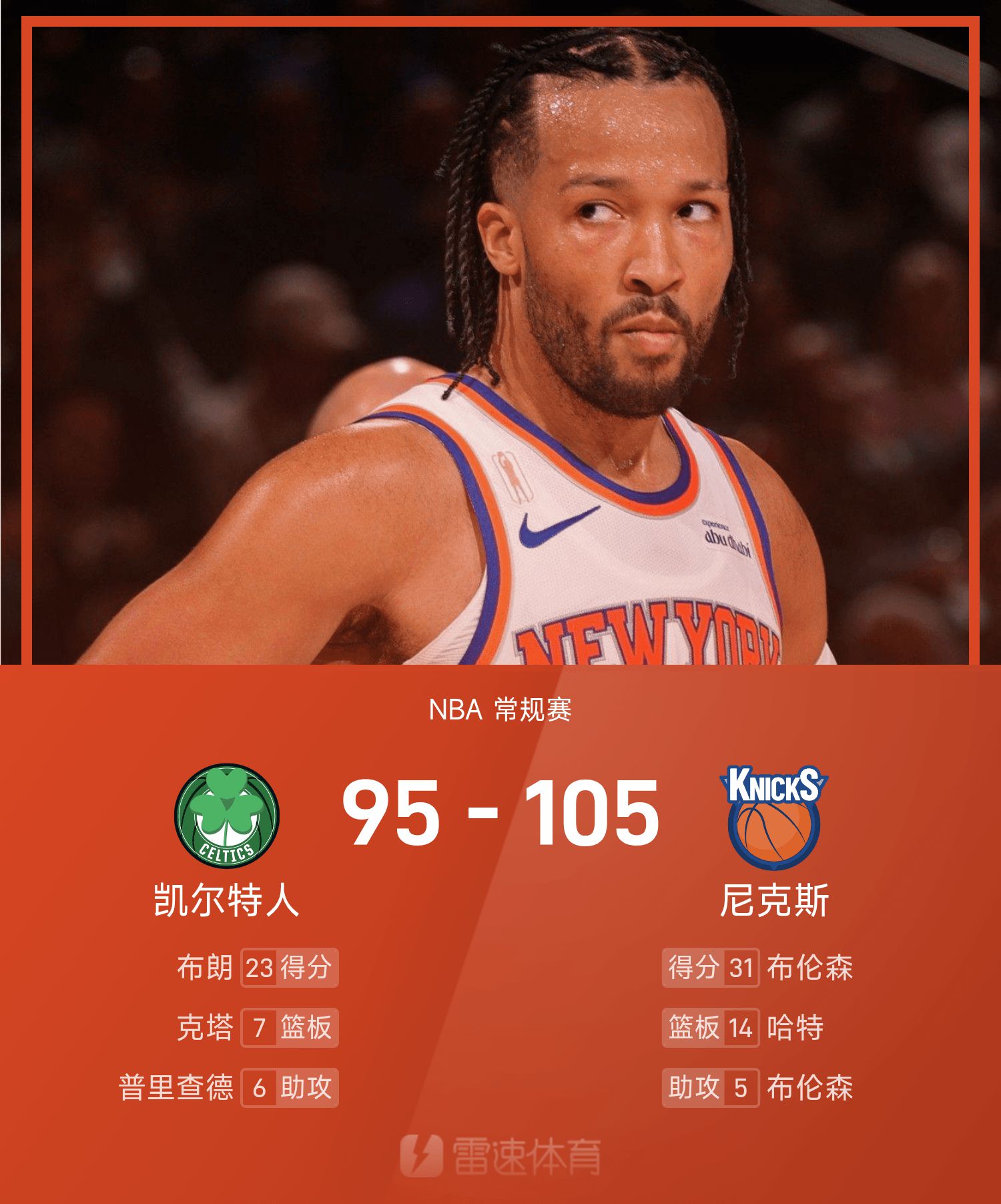 6686体育10月25日讯 25/26赛季NBA常规赛,尼克斯对阵凯尔特人。双方全场战罢,尼克斯105-95战胜凯尔特人。布伦森砍下全场最高的31分3板5助,率领尼克斯胜利取胜。