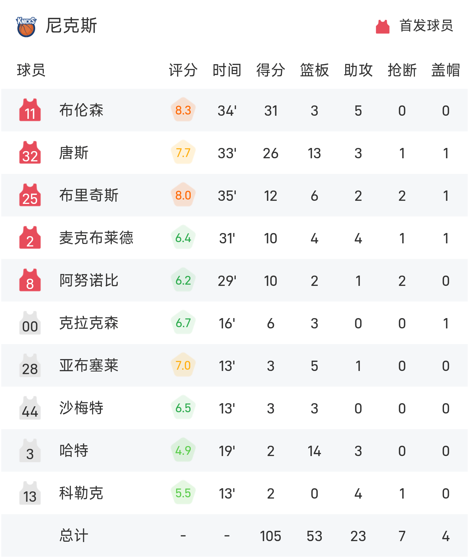 NBA战报:布伦森31分,唐斯26+13,尼克斯105-95凯尔特人