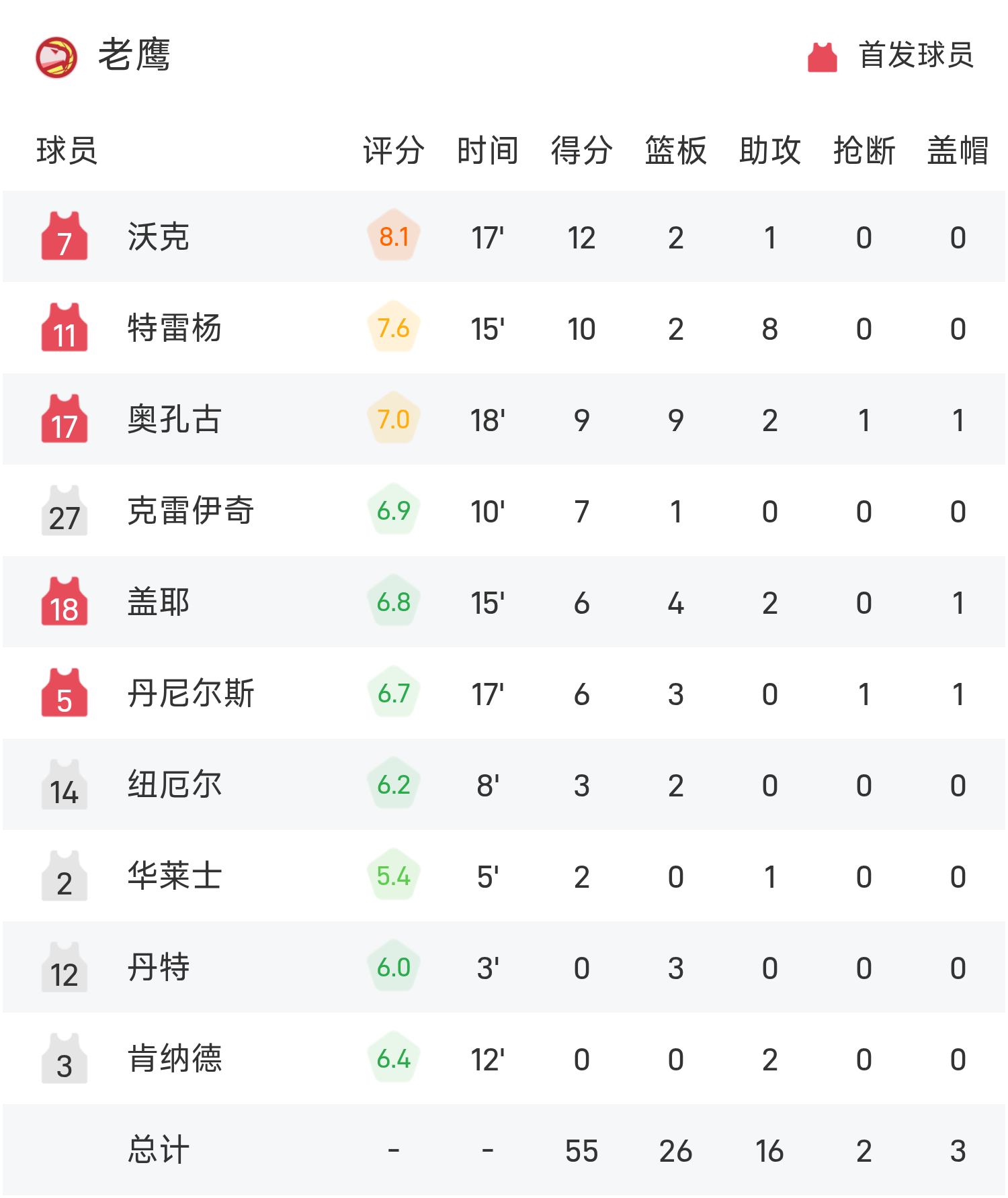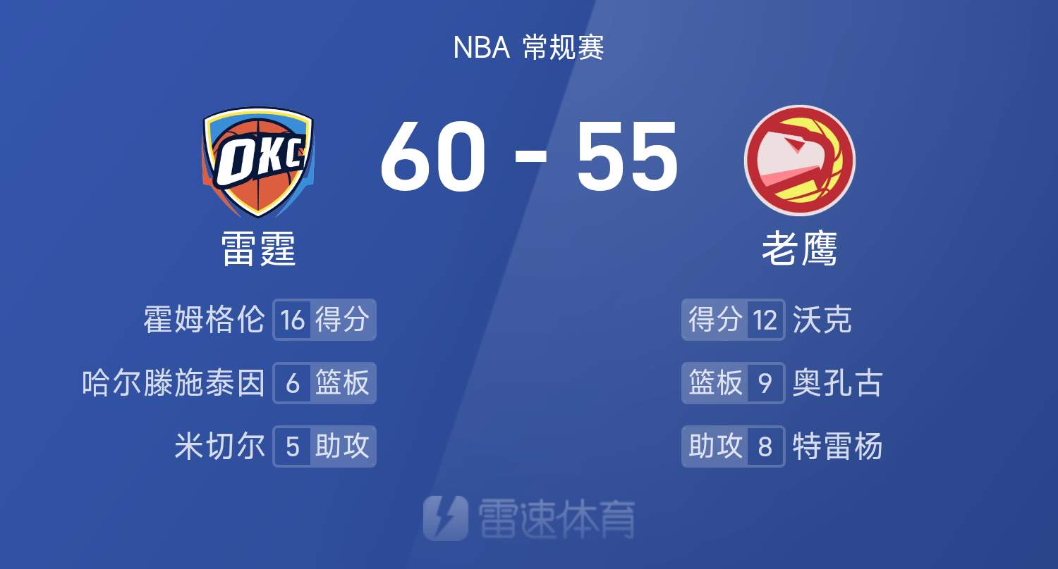 NBA半场:霍姆格伦16分,SGA13分4板,雷霆60-55领跑位老鹰